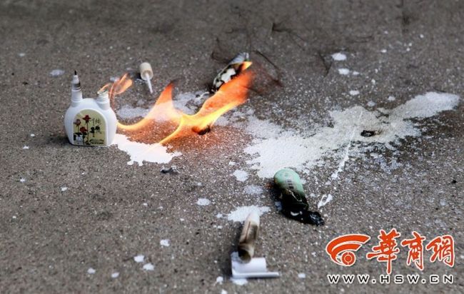 核心提示: 昨日,記者在市麵上購買了7種修正液,在雁塔消防大隊世家星城中隊的幫助下,逐一點燃。好奇心實驗室實驗表明,7種修正液均為可燃性液體。