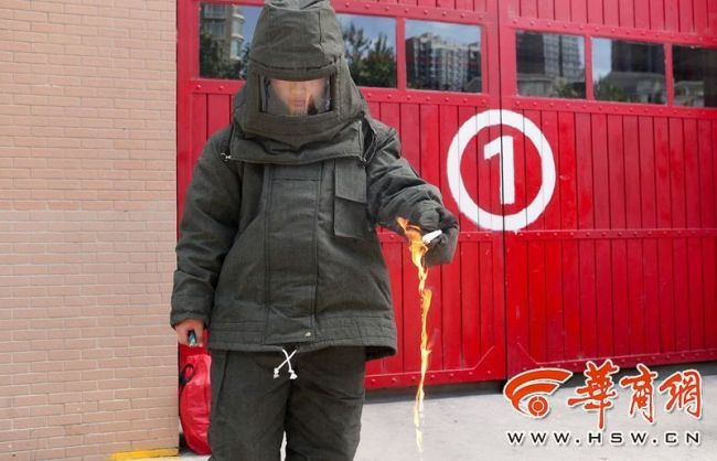 消防官兵點燃一支外形較長的修正筆,10秒鍾後修正筆筆頭被燒爛引燃了裏麵的修正液。當消防官兵每捏一下修正筆,火舌直接從筆頭向外噴出一米遠。